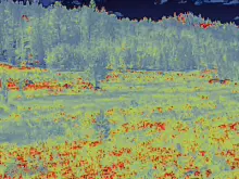 Objects with lower temperatures are shown in blue or dark blue and higher temperatures are shown in red and yellow.