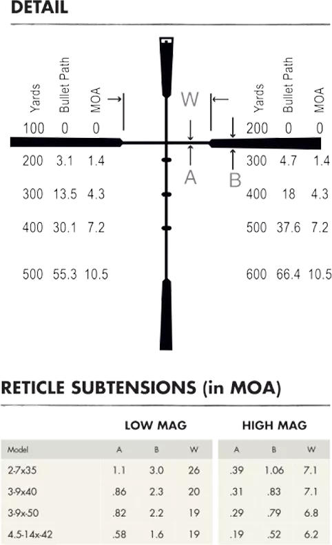 | Item Number | MSRP | Description | Reticles | Color | Knob Style | Illumination | Magnification | Objective Diameter | Objective Lens Diameter | Finish | Ocular Diameter | Focal Plane | Main Tube Size | Field of View | Eye Relief | Exit Pupil (low - high) | Click Value | Elevation Adjustment, Total Capability | Windage Adjustment | Parallax/Focus | Length | Weight |