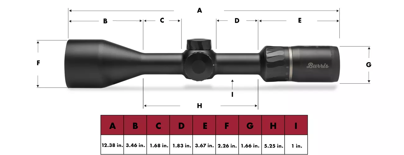 | Item Number | MSRP | Reticles | Color | Knob Style | Illumination | Illumination Control | Illumination Settings | Combo Package | Magnification | Objective Diameter | Objective Lens Diameter | Finish | Ocular Diameter | Focal Plane | Main Tube Size | Field of View | Eye Relief | Exit Pupil (low - high) | Click Value | Elevation Adjustment, Total Capability | Windage Adjustment | Parallax/Focus | Length | Weight | Battery |