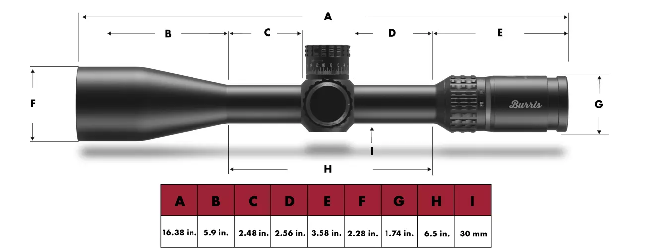 | Item Number | MSRP | Description | Reticles | Color | Knob Style | Illumination | Illumination Settings | Magnification | Objective Diameter | Finish | Focal Plane | Main Tube Size | Field of View | Eye Relief | Exit Pupil (low - high) | Click Value | Elevation Adjustment, Total Capability | Windage Adjustment | Parallax/Focus | Parallax | Length | Weight | Battery |
