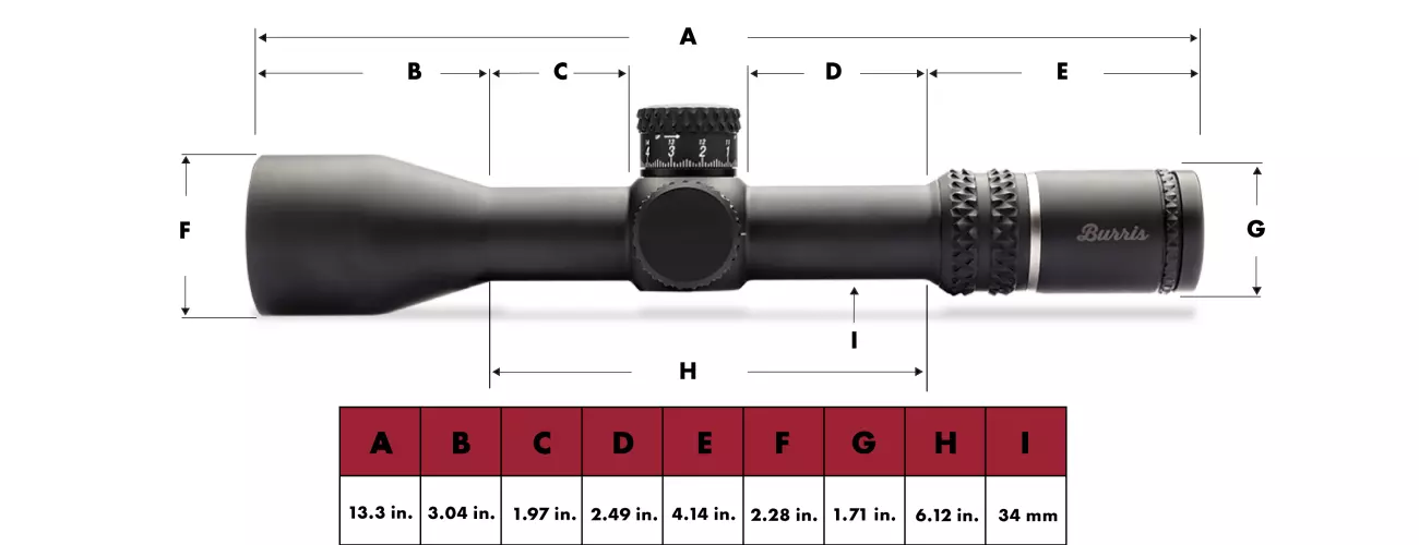 | Item Number | MSRP | Reticles | Color | Knob Style | Illumination | Illumination Control | Combo Package | Magnification | Objective Diameter | Objective Lens Diameter | Finish | Ocular Diameter | Focal Plane | Main Tube Size | Field of View | Eye Relief | Exit Pupil (low - high) | Click Value | Elevation Adjustment, Total Capability | Windage Adjustment | Parallax/Focus | Length | Weight | Battery |